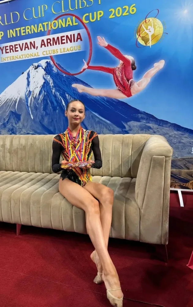 Воспитанница нашей школы Савичева Милана приняла участие в "Международном турнире по художественной гимнастике. Этап кубка клубов мира" (международная клубная лига). Турнир прошел 21-24 марта 2026 года в г. Ереван (Армения). Милана завоевала две золотых медали в упражнениях с обручем и лентой, серебро в упражнениях с булавами и бронзу в многоборье. Тренер Миланы – Стебенева Ольга Алексеевна.
